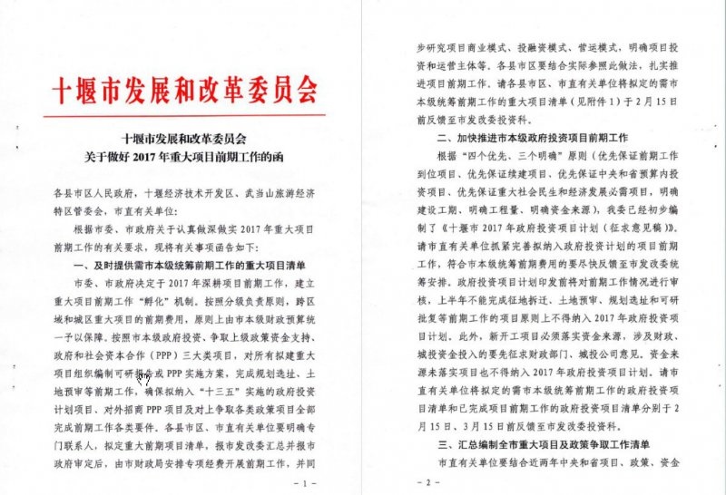 十堰市發(fā)展和改革委員會關(guān)于做好2017年重大項目前期工作的函