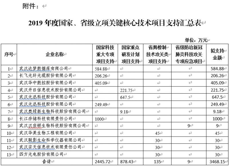 武漢東湖新技術(shù)開發(fā)區(qū)關(guān)于2019年度國家、省級立項關(guān)鍵核心技術(shù)項目支持結(jié)果的公示