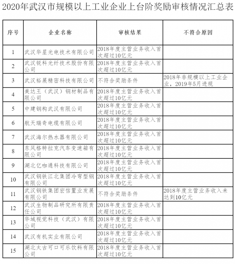 市經(jīng)信局關(guān)于2020年武漢市規(guī)模以上工業(yè)企業(yè)上臺階獎勵項(xiàng)目審核情況的公示