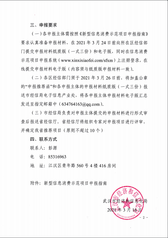 各申報企業(yè)需按照《新型信息消費(fèi)示范項(xiàng)目申報指南》要求認(rèn)真準(zhǔn)備申報材料,在2021年3月23日17:00之前提交申報材料紙質(zhì)版(一式三份)至東湖高新區(qū)政務(wù)中心7號樓7016室和word電子版及PDF蓋章版一并打包發(fā)送至郵箱1930171438@qq.com,同時在信息消費(fèi)示范項(xiàng)目申報系統(tǒng)(www.xinxixiaofei.com/sfxm)上注冊登錄,在線提交申報材料電子版(內(nèi)容須與紙質(zhì)版申報材料一致)。